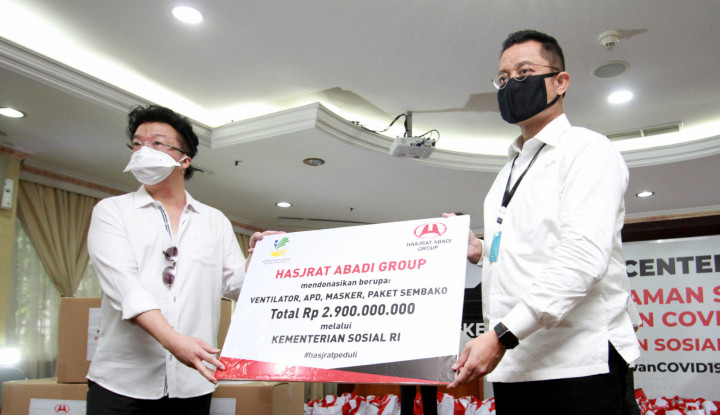 Menteri Sosial Juliari P. Batubara (kanan) menerima secara simbolis bantuan Alat kesehatan dari Direktur PT Hasjrat Abadi Roy Tandaju (kiri) di Kantor Kementerian Sosial, Rabu (6/5).  Hasjrat Abadi Group, perusahaan distributor eksklusif kendaraan Toyota dan Yamaha di sebelas provinsi wilayah Indonesia bagian Timur mendukung pemerintah menanggulangi pandemi Covid-19 dengan menyalurkan bantuan untuk tenaga medis yang merupakan garda terdepan dalam penanganan Covid-19.